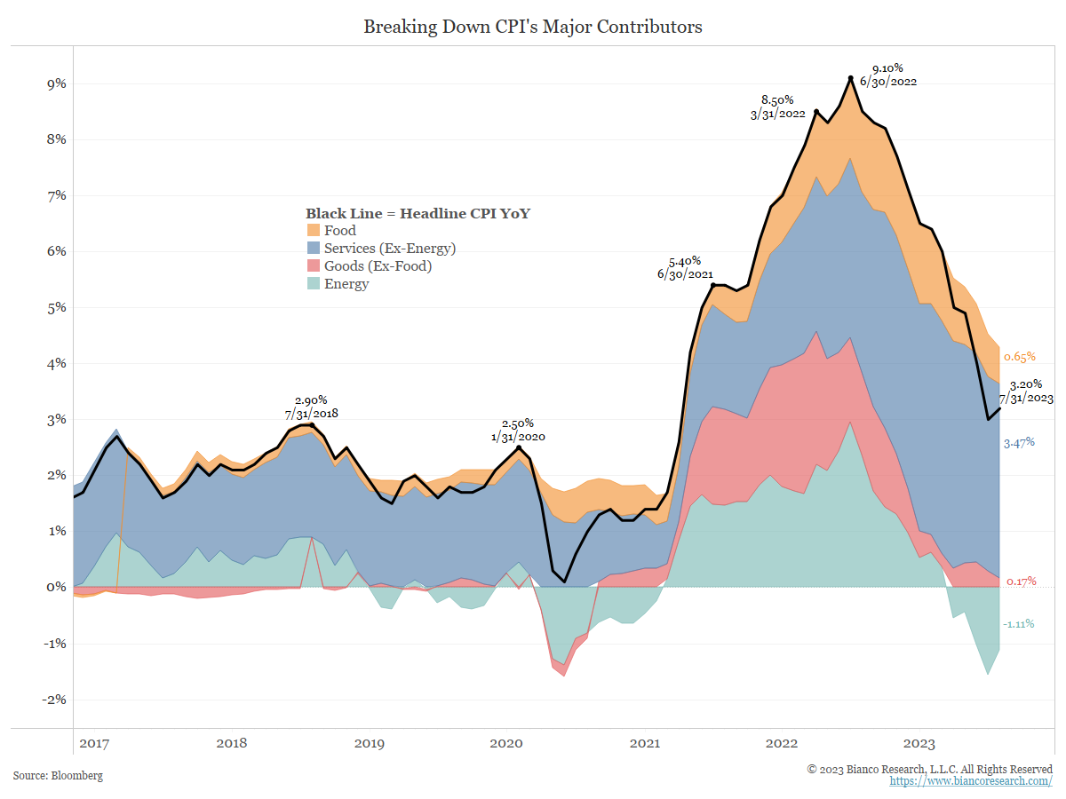 As the chart above shows, food, energy, and goods’ contributions to headline CPI are already back to their historical norms. Those categories have contributed to the decline in inflation for about as much as they can. In addition, gas prices have risen significantly so far in August, and we can expect that category will work against further declines.
