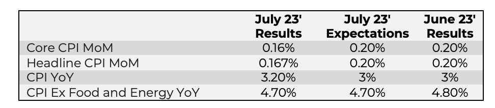 The July CPI came out to be another soft report and points to further moderation in inflation. Headline CPI increased by 0.2% MoM (0.167% unrounded), which resulted in the YoY rate increasing two-tenths to 3.2% as base effects were less favorable than last month.