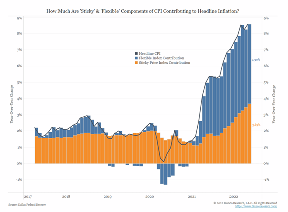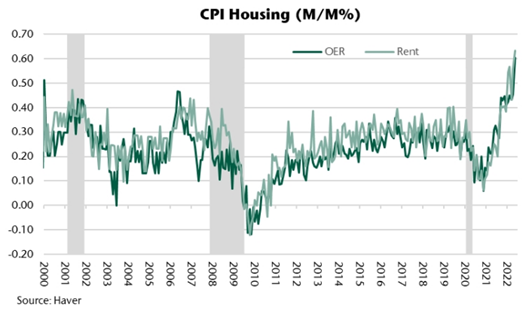 We did see a notable slowdown in furniture and appliances, which were up just 0.1% MoM, the smallest increase since last summer. This is a function of the inventory buildup, but it’s clearly not enough to offset pressures elsewhere. The swings in gas prices or used car prices could be explained away as transitory, but the jump higher in shelter costs will grab the Fed’s attention. While one month’s number can be overlooked, sticky costs such as housing continue to head in the wrong direction and remain very problematic for the Fed. Of the 8.6% year-over-year increase in CPI, 3.69% came from the more stable components of the index.