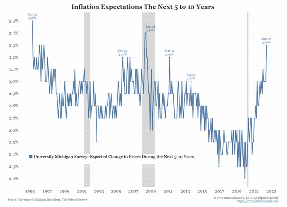The University of Michigan’s Consumer Sentiment Survey showed just how badly the consumer is hurting right now. The June 2022 print, released on Friday, fell to its lowest level ever over its 70-year history. Maybe more importantly, the survey also shows the inflation expectations over the next 5 to 10 years broke out to the highest level since June 2008 and its second highest reading in 28 years.