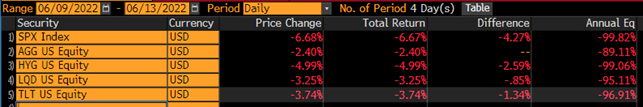 We have been a broken record on this, but the Fed will have no choice but to continue hiking until inflation begins to recede. The Fed put is dead (for now). The markets understand this, which is why stocks are taking a beating the last two trading days (S&P 500 down -6.67% & the Barclays Aggregate are down -2.4% since Friday 6/10).