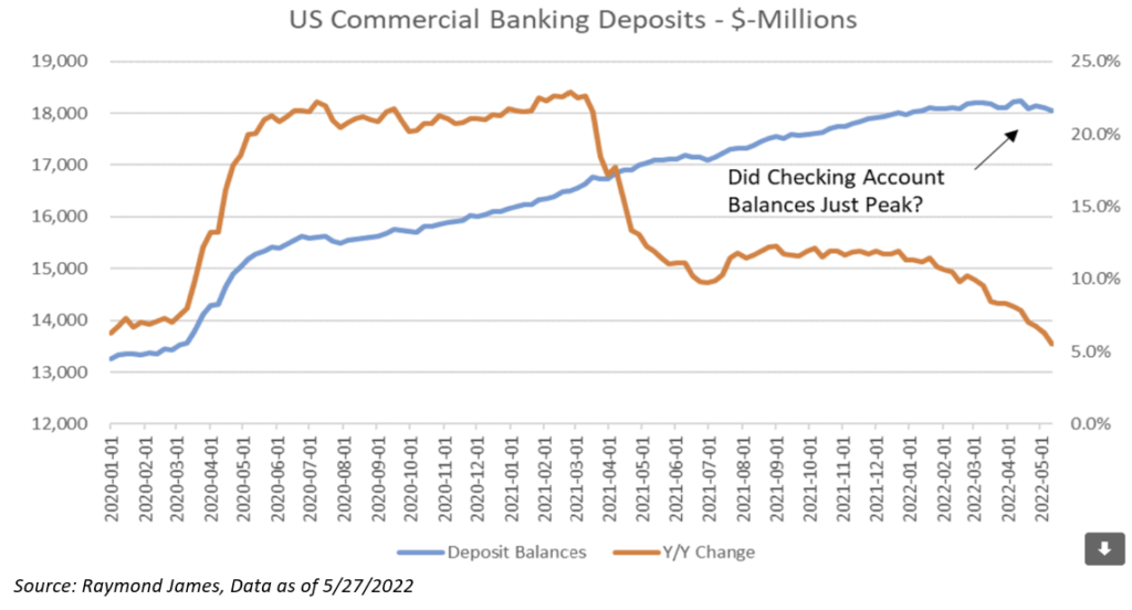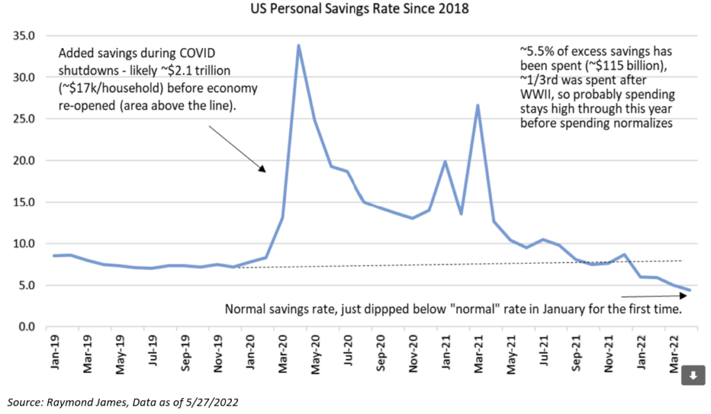 This irks me… a lot actually. I think there are some misconceptions regarding the personal savings rate and what it means. Thus far in 2022, consumers are spending more year-to-date than they typically do through April – but, this doesn’t mean that the consumer is tapped out. According to Raymond James, the consumer has only spent 5.5% of the excess savings that they amassed during the pandemic. The only other time that consumers had this large a boost of excess savings was during WWII – where they spent 1/3 of their savings. Personal savings, which have been decreasing, is an income statement metric, not a balance sheet metric.
