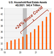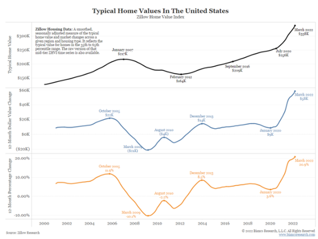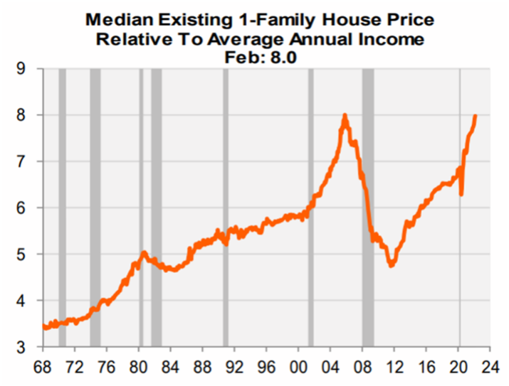 Mortgage rates are rising drastically as long-term Treasury rates have climbed to start ’22 making higher borrowing rates and monthly payments more expensive. This comes in the face of 36 months of rising US home prices. Prices have increased by 19% over the last year and doubled over the last 10 years. Our chart above shows the median family house price relative to average annual income which is back near the ’06 highs in the face of appreciating home values.