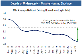 We are facing a chronically undersupplied housing market. Since the GFC, home building has severely lagged the necessary trend to meet a growing American demand. Freddie Mac estimates that as of 2020, the US housing supply was short 3.8M units, with COVID having hurt construction. So, millions of new homes need to be built to catch up with demand. But it is estimated that only 600,000 new units will be added this year, and a max of 1.5M new annual starts going forward…barely enough to match new household formation.
