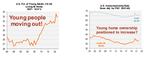 Young people, including some forced “home” due to the pandemic, are showing signs of coming back into the housing market – a demographic tailwind. We believe the millennial cohort of the population will continue to create support for the housing market as they purchase homes, especially outside of the big cities.