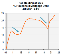 The Fed has been accumulating a MASSIVE number of Mortgage-Backed Securities (MBS) since March of 2020 and now that the Quantitative Tightening (QT) program is starting, they will be letting lots of mortgages run off its balance sheet and may even outright sell some – putting upward pressure on their yields and the spread between a Treasury and MBS (currently about 260bps).