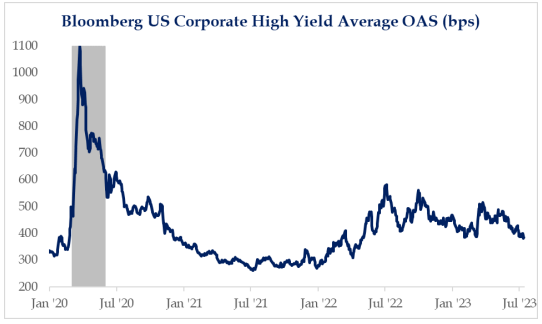 High yield spreads have compressed back to the lows that were seen prior to March’s mini-banking crisis. At ~380 basis points they are also at the lowest levels in more than a year.