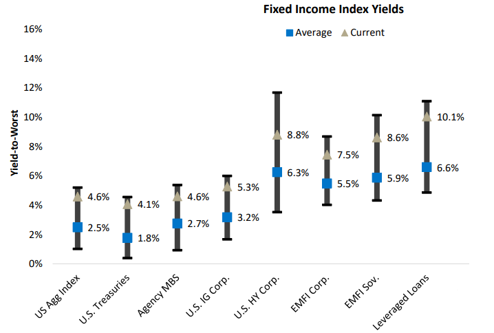We’ve seen several bullish fixed income commentators show graphics like the one below, which compare current fixed income yields versus their 10-year ranges and tout their attractiveness.