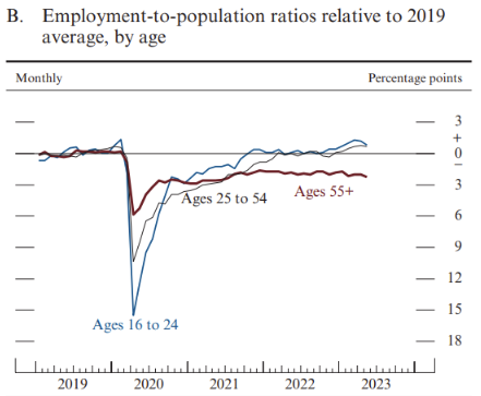 In the Fed’s recent monetary policy report, they showed how the labor shortage is partly due to early retirements. The labor force participation by those 55+ is notably below pre-pandemic levels and as of now, it does not look like it will recover.