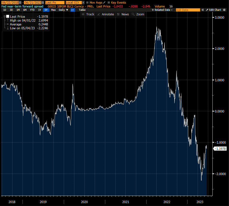 The gauge reflects investors’ expectations of the Fed Fund Rate roughly over the next year. A negative spread suggests that traders are predicting the Fed will cut rates because a recession is imminent in anticipation of an economic downturn. This forward spread first inverted in November of 2022 and made a low in early May. It has re-steepened by about ~50bps since early May although it’s still -119bps inverted.