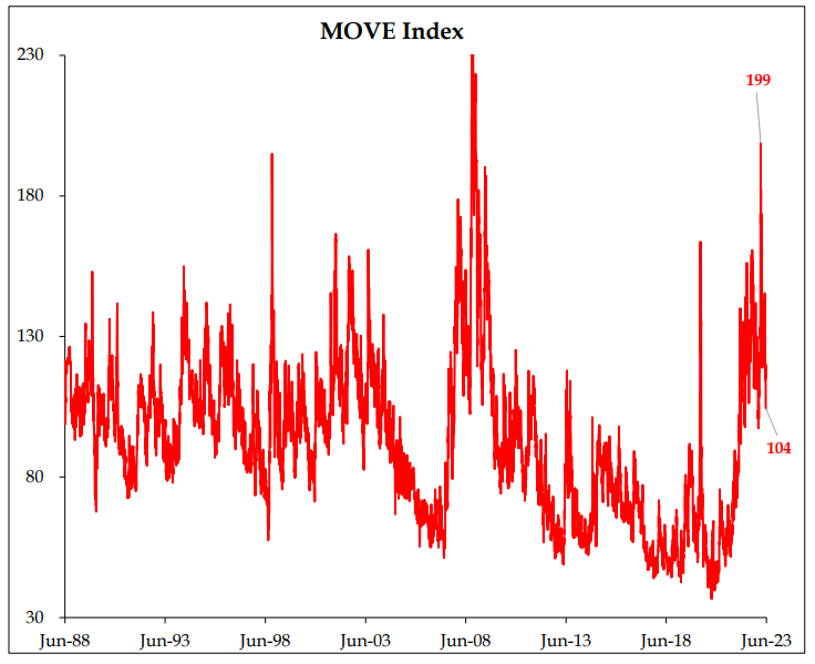 The MOVE Index, which is another measure of bond volatility, has now returned close to its lowest level of 2023, further indicating that stress is easing.