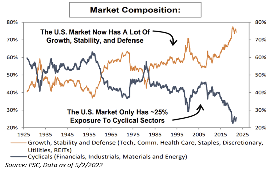 When comparing multiples to history, it is important to remember that index composition changes over time, and because of this, one cannot make a direct comparison of today’s market to a previous market episode. There wasn’t a single financial company in the S&P 500 until 1976, and until 1988, 400 of the S&P 500 companies were Industrials! Comparing the P/E of the market today vs history is akin to comparing apples and oranges.