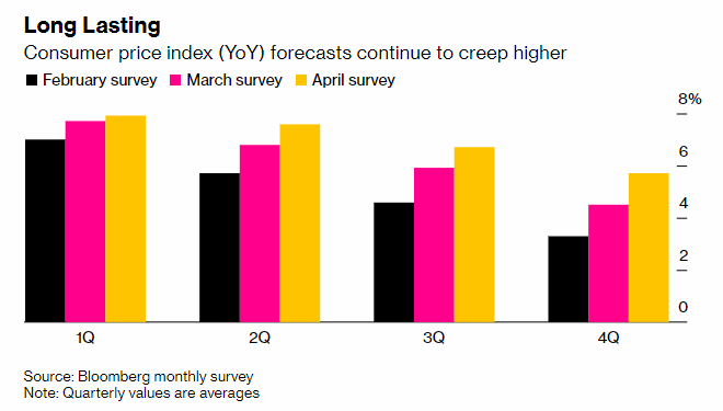 The Bloomberg survey of Economists (median forecast of 72 economists) shows the CPI will average 5.7% in the final 3 months of the year, up from 4.5% estimated a month ago.