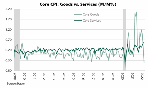 The buildup of retail inventories has undoubtedly helped dampen goods inflation. Over the last 12+ months, an overstimulated consumer – in addition to supply chain issues – has created a goods mania drastically pressuring pricing of goods…it finally looks to be ending. The new lockdowns in China do create some upside risk for these categories in the coming months if we get more supply shortages.