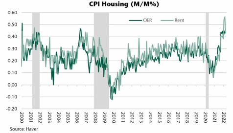 Compared to the volatile energy component of CPI, housing prices(i.e., owner-equivalent rents) are far more stable (although lagging), and they continue to remain firm. The 6- month annualized Owners Equivalent Yield (OER) has risen 5.3% while Rent of Primary Residence (RPR) 6- month annualized changed sits at 5.59%, the highest level since 1986. Rental inflation did slow from 0.6% to 0.4% MoM and OER was unchanged, potentially a hint that the worst is over?