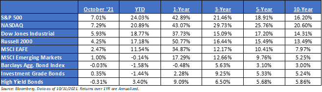 - Q3 Earnings Results: So far, the “important” part of earnings season is essentially over, and the results are better than expected. Companies have cited margin issues and supply chain disruptions, but up to this point management teams have been able to navigate these issues and investors are looking past the disruptions as temporary and are instead focusing on continued strong demand. Put plainly, fears that all of these factors would potentially reduce expected 2022 S&P 500 earnings has not come to fruition. That’s why you’ve seen this market rally to all-time highs, led by the “average stock”, i.e., not MAGA.