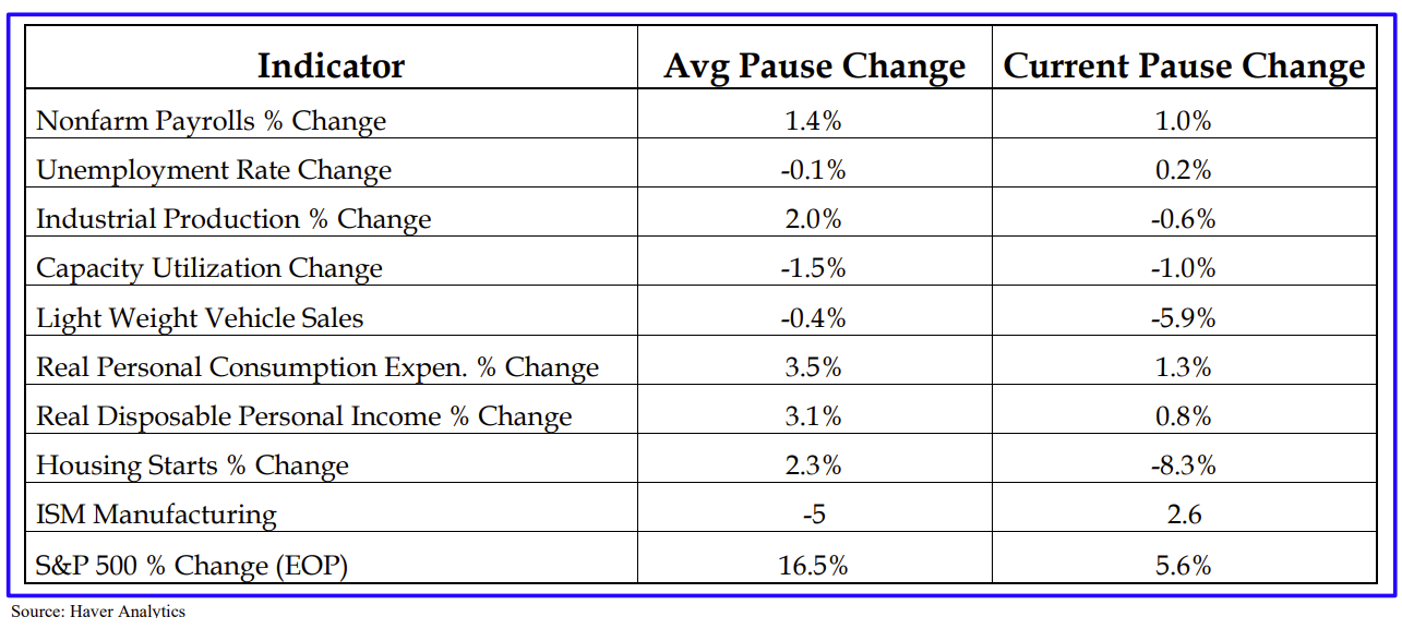 Brett: A pause in a Fed rate-hiking cycle has generally been good for stocks; the stats in this pause have been a bit underwhelming