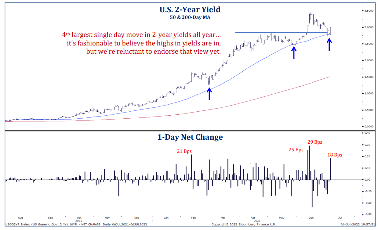 In 2022 alone we’ve seen some significant moves within the yield of the 2-year Treasury. As the market attempts to dissect the future direction of Fed (i.e., how aggressive will they be before halting the hiking program), the bond market is experiencing eye popping moves in both directions. It is of our opinion that while at this point in a S&P 500 drawdown the Fed is typically cutting rates, this time is quite different.