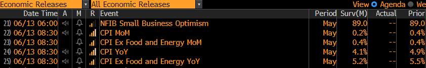 Next week brings both the CPI print and the FOMC meeting. The survey has headline inflation printing at 0.2% MoM and 4.1% YoY, with core inflation at 0.4% MoM and 5.12% YoY. These numbers are relatively close to expectations from the Cleveland Fed’s Inflation NowCast: