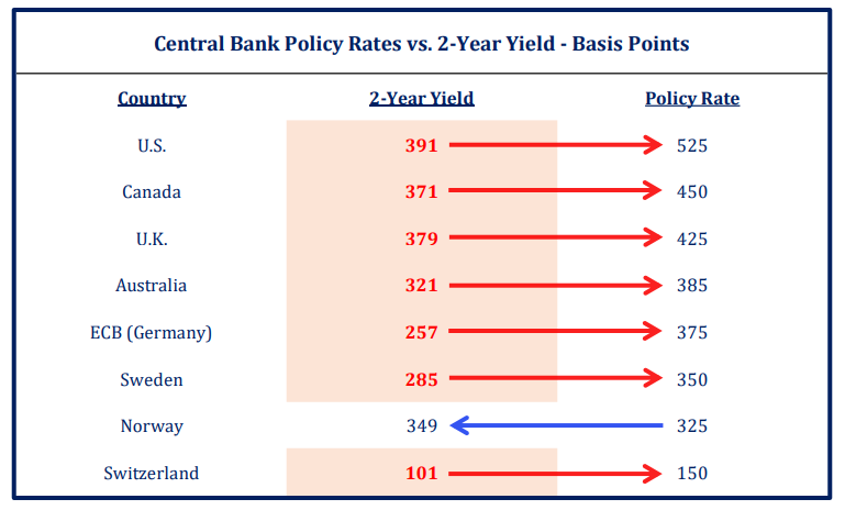 Almost everywhere we look, 2-year yields are trading below Central Bank Policy Rates. As we are nearing the end of most hiking campaigns in the developed world, the real question is ultimately how long will rates stay elevated? Markets think inflation is last year’s problem and will quickly retrace to something more tolerable, allowing for quick rate cuts.