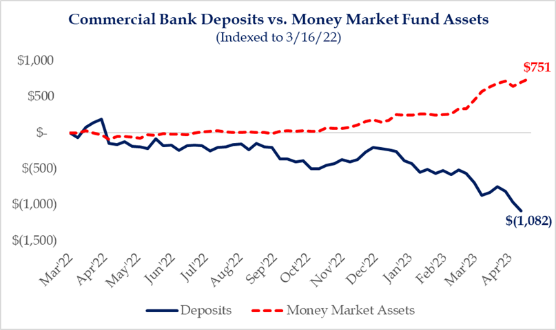 Deposit flight still remains a risk for banks, as the weekly Fed data continues to show outflows. Commercial bank deposits, which yield next to nothing, have fallen by roughly -$1,082 bilion, while money market mutual funds, yielding > 4%, have taken in +$751 billion since the hiking cycle started.