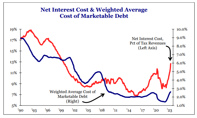 US debt servicing cost now sits at its highest level since August 1999. This may sound arcane, but the debt servicing cost is the key indicator for fiscal policy. The current 30-year trend of accommodative fiscal policy is ending.