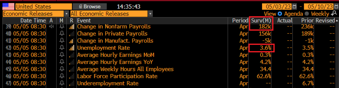The NFP jobs number comes on Friday and is likely to continue to show a relatively tight jobs market and low unemployment number (jobs add of 182k and 3.6% unemployment). Elevated jobs prints will continue to reiterate the need for “higher for longer” as wage inflation is still worrisome (currently at 6.4% as measured by the ATL Fed).