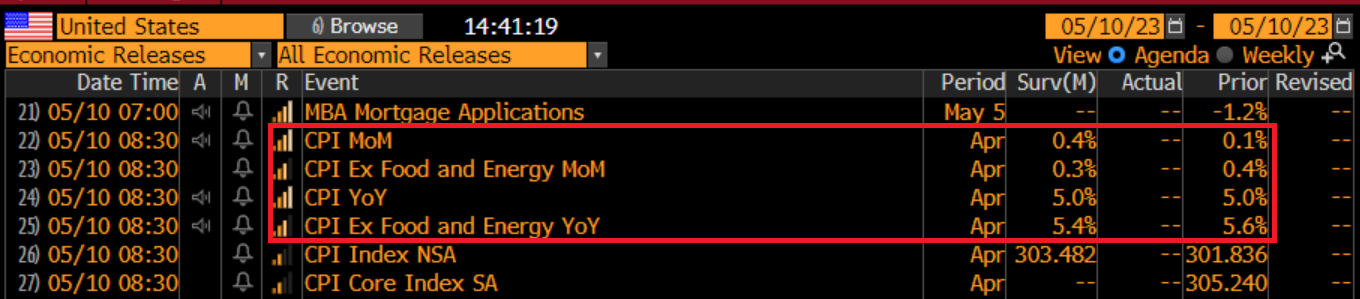 In addition, the next CPI data comes on 5/10. Highlighted in the Cleveland Fed Graphic #1, their estimate on the monthly print for both Headline and Core Inflation data are notably higher than Bloomberg estimates shown in Graphic #2. This will be interesting as the Headline data will account for the large oil spike following the surprise OPEC production cut last month.