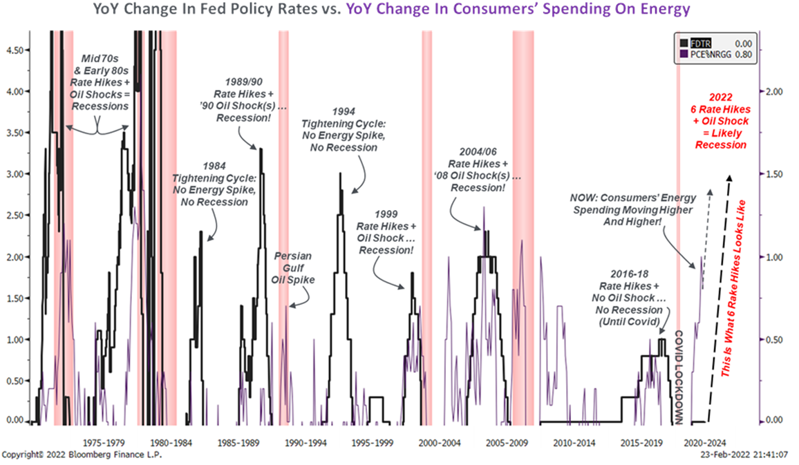 Now, the below chart isn’t easily digestible –so let me walk you through it. First, we’re looking for increases in Fed policy rates and oil prices, specifically year-over-year changes. The Y-Axis is cut off at zero because I’m not worried about declining Fed Funds rates and Energy pricing. Look at each Fed tightening cycle and how much the Fed hiked over a 12 month period (left scale). Next, take a look at the purple line, which plots the annual change in consumers’ spending on energy as a share of their total spending.
