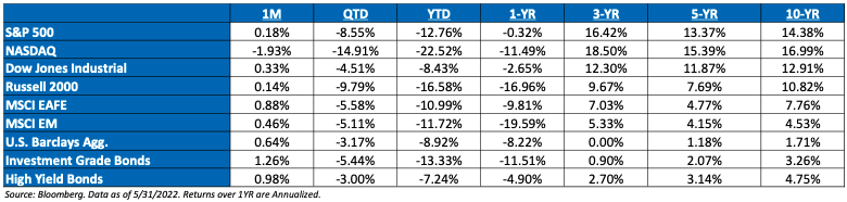- Earnings Highlights – Overall, 2022 consensus EPS are up modestly, but what is most noteworthy is how this earnings trend has skewed between indexes with small cap and value indexes seeing much more significant positive earnings revisions, while growth and larger cap indexes, more negative. While consensus 2022 EPS rose 1% since April 1, it was entirely driven by Energy (-0.2% ex-Energy). Over this past retail earnings season in middle May, we started to see a shift if spending habits by the consumer, spooking the market.