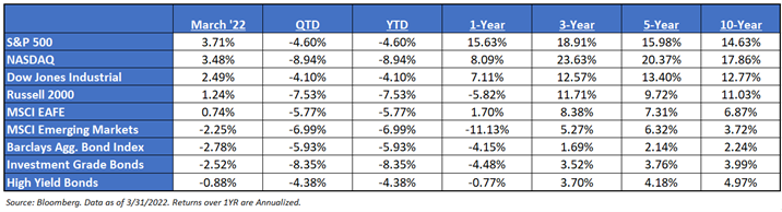 - Monthly Recap: March was a tale of two different periods (see below). The first quarter was one of the worst on record for the collective performance of stocks and bonds, with the latter worse than the former. This makes sense given investor concern focused more on the “Fire” (inflation and the Fed) than the “Ice” (growth slowdown).