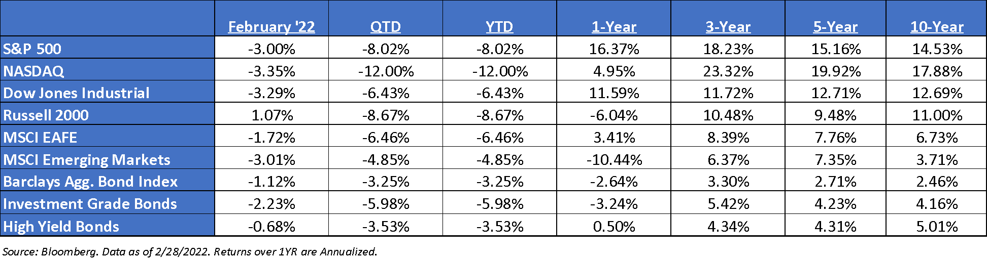 The market, measured by the S&P 500, officially entered a “correction” phase, as investors continue to disseminate the latest news on the Russia/Ukraine front. Markets have been attempting to price in worst case scenarios as it pertains to Russia and Ukraine over the last several weeks. While there has been significant multiple contraction and risk off action over that time frame. One of the hardest things to do when faced with a major global event – whether it’s weather: e.g., hurricanes, floods, tornadoes, etc., or a military conflict, as we are facing today – is to separate the emotional response from the economic implications. Through February the S&P finds itself off a little more than -8% for the year – since 1950, only 2020 (-9%), 2009 (-19%), 2008 (-9%), and 1978 (-9%) have been worse.