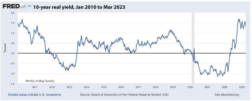 Real yields are calculated as nominal yield less inflation expectations. Real yields can be calculated across the interest rate curve (i.e., 1YR, 3YR, 5YR & 10YR yields). Once the Fed began tightening policy, real yields started shifting higher, breaching positive territory in June of 2022 and have risen significantly since.