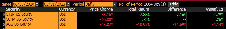 The above graphic shows the performance of TIPS versus the Aggregate Bond index, since the inflationary scare poked its head into the news narrative in late June of 2020. From June 2020 – February 2023, monthly CPI inflation has averaged .5% MoM or 16.4% in aggregate which equates to 5.96% annualized. This is nearly 3x the Fed’s mandate of 2%.