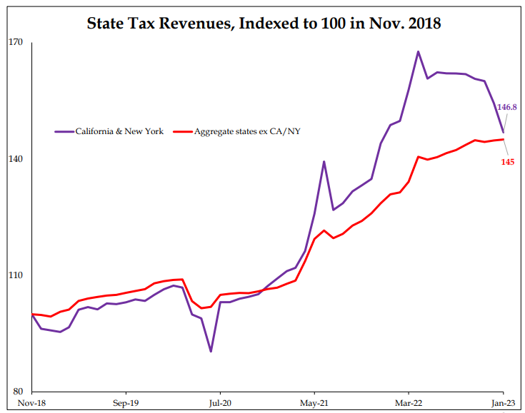 A few states like California and New York are facing problems with high costs of living, high crime and weakening state income taxes which is beginning to weigh on tax receipts. In addition, budget problems are spilling over to their fiscal situation (i.e., a balanced budget ain’t in the cards) like rising unemployment and a likely drop in corporate taxes. We know both of these states are highly reliant on capital gains tax revenues which are harder to find given the decline in asset values the last 15 months.