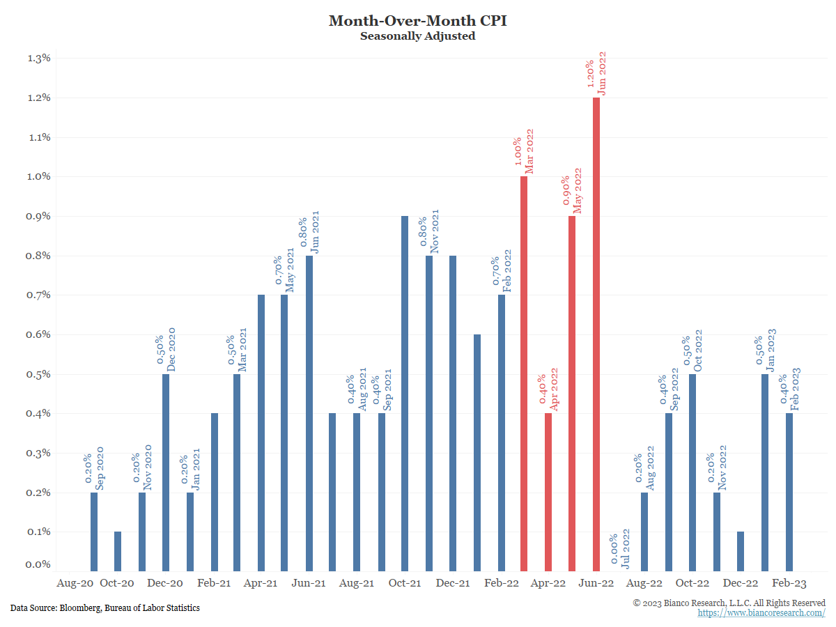 Between March 2022 and June 2022 (red), the month-over-month change in CPI was much higher than in the 2020 period. This means the current monthly numbers will have a much higher bar to surpass if inflation is going to remain elevated. This changes dramatically come July where MoM changes from July – December of 2022 were much lower.