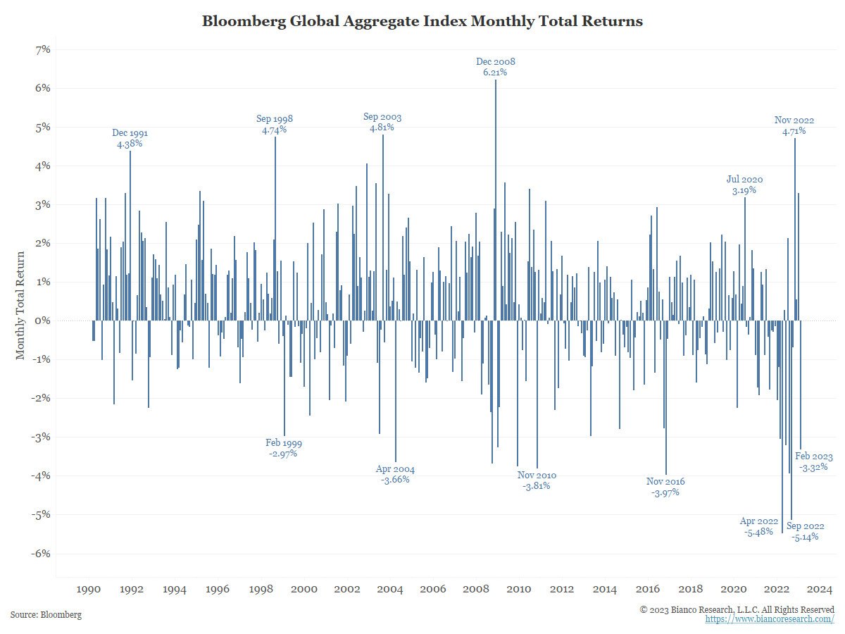 While bonds got off to a fast start this year, February’s returns were almost the mirror image from a total return standpoint. As the chart shows, Bloomberg’s Global Aggregate Index returned -3.32% last month. With data going back to March 1990, this ranks as the ninth worst monthly total return. The Barclays Aggregate (AGG) lost 2.59% in February, which ranks as the 15th worst monthly total return since 1976. Rate volatility appears here to stay… a point we’ve been repeating.