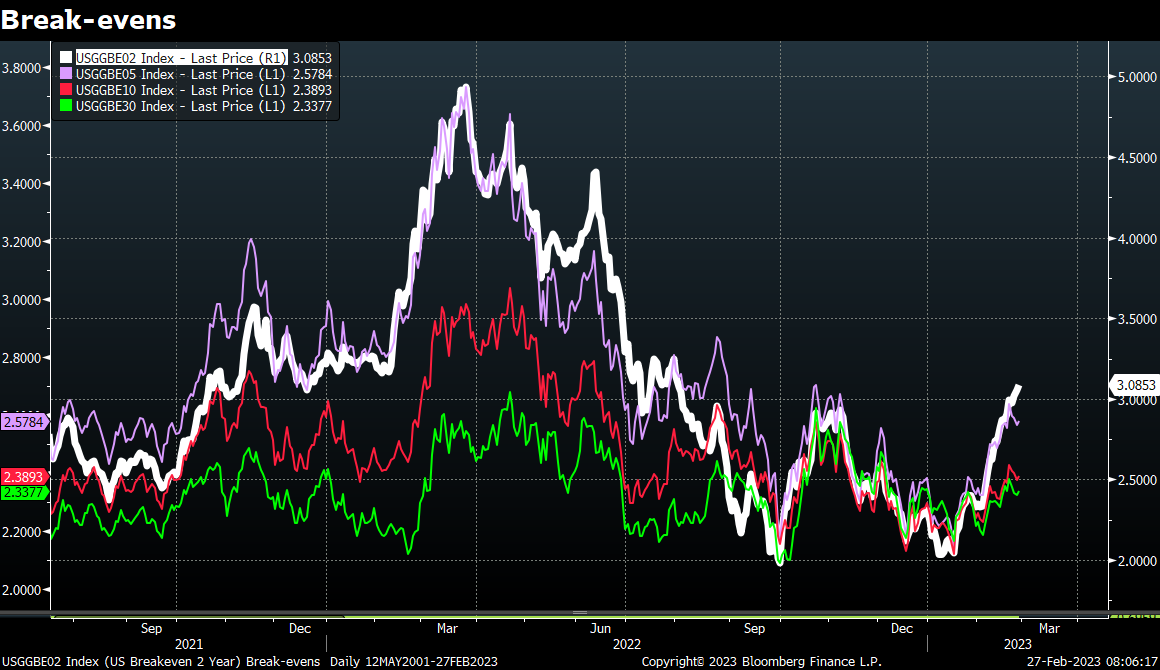 Investors are anticipating more persistent inflation, shown by US breakevens rising sharply the past month and a half. Over the last six weeks, 2-year breakeven rates are up roughly +120 basis points (while 1-year breakevens up nearly +180bps since January 10th) despite the continued indifference from oil. It’s an odd divergence, as market-based near-term inflation expectations and crude are generally tied at the hip.