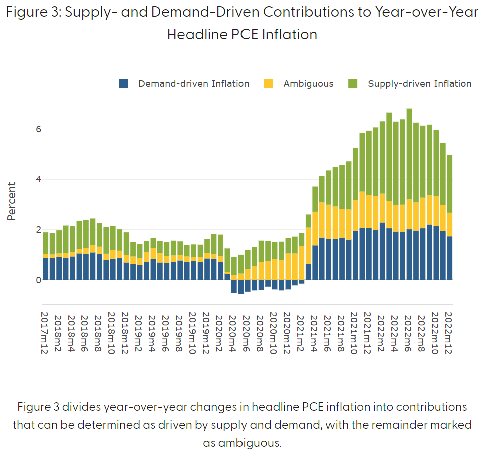 The Fed raises interest rates to slow down demand, but as we know they can’t push up supply. Adam Shapiro, an economist at the San Francisco Fed, estimates that about 40 per cent of inflation is supply-driven, 40 per cent is demand-driven, and the other 20 per cent is ambiguous (graphic above). Given that reality, the Fed alone cannot get inflation back to their 2 per cent target. The Fed is playing its role by raising rate which is contributing to the slowing of growth but at the same time, demand management is not an efficient way to deal with supply-driven inflation.