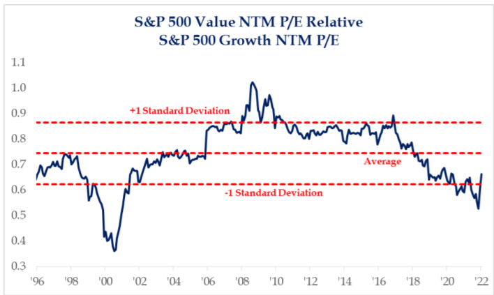 Much of the cyclical areas of the market that rallied last year have extended their dominance in 2022. Year to date, this Value rotation is beating Growth by a staggering 11.53%. This is in the 99th percentile of monthly Value returns over the past 44 years.