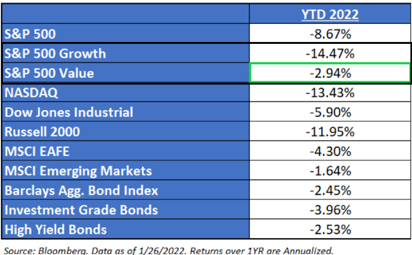The recent market volatility has been keeping us busy, or maybe the fact that I’m still celebrating a Cincinnati Bengals playoff victory against the first-seeded Tennessee Titans last week – WHY NOT US? Speaking of Value, at the beginning of the year, the Cincinnati Bengals were not projected to come close to winning the AFC North, let alone making it to the AFC Championship. One could say, in Vegas terminology, that the Bengals have been trading at a Value all season – Value that has proven to be victorious. Yet, the Bengals weren’t the only Value trade winning – in fact, to begin 2022, the Value-style of investing has been all of the rage across all market cap spectrums.
