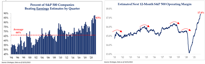 Earnings have been more positive than feared early in the month, but upside is clearly less than the prior three quarters. In the prior three quarters, 2021 consensus EPS for the S&P 500 was increased by ~$10 each earnings season, this season it looks like it is going to be ~$3-4 (from ~$199 to ~$203). This is still very strong historically, but also shows the meaningful sting of supply chain shortages.