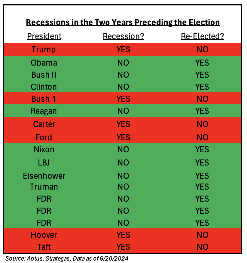 Now, why does this happen? Presidents like to “prime” the economy into an election year to minimize an election fallout. Presidents know that if there is a recession in the third or fourth year of an election cycle, the incumbent is not re-elected. Given the fiscal stimulus and liquidity injected into the economy, stocks have historically responded favorably during re-election years, and 2024 has been no different.