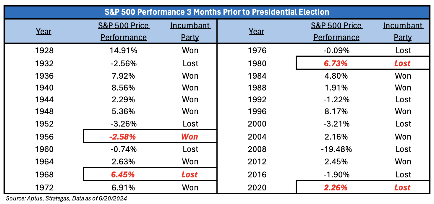 Fact #3: The S&P 500 in the final 90 days of the election has predicted 20 of the last 24 election winners. This is why the market has been so laser-focused on the Fed and the potential for policy easing in the second half of 2024. If stocks were higher in the 90 days before the election, the incumbent party won and vice versa. This metric did not work in 2020 but worked in the previous nine presidential election years.
