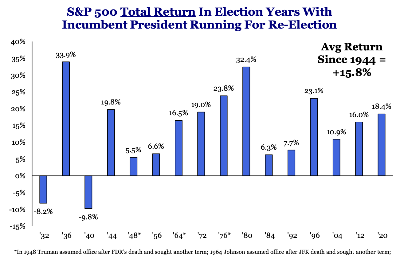 Fact #1: The S&P 500 has increased in the past 13 presidential re-election years. In fact, the last time the S&P 500 fell in a presidential re-election year was 1940. And since 1940, there have been three years where the market fell during the election year – 1960, 2000, and 2008. The commonality of these three years is that there was an open election – JFK, Bush, and Obama. Furthermore, the average return of the S&P 500 during re-election years is 16%!